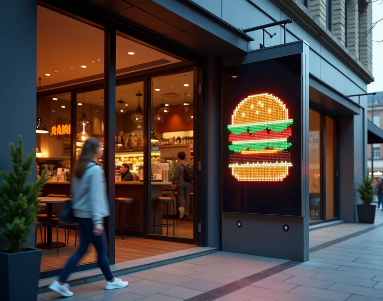 LED-Panels fügen sich elegant in das Gastronomie-Ambiente ein, ob an der Wand, am Tresen oder im Schaufenster. Die schlanke, rahmenlose Optik sorgt dafür, dass Inhalte wie Menüs und Specials perfekt in Szene gesetzt werden.